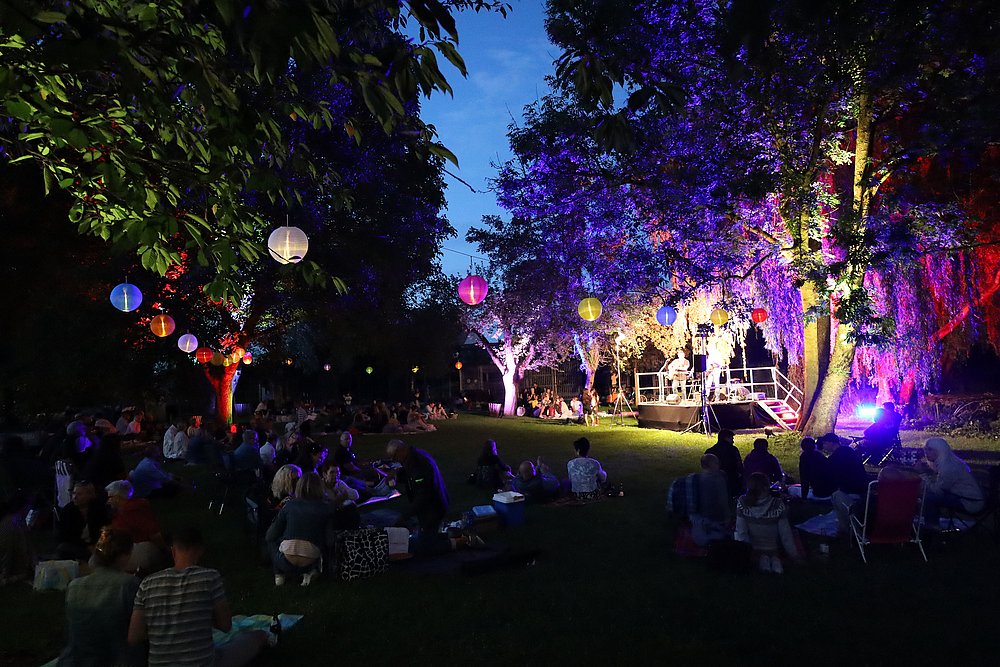Die Sonne taucht den Stadtpark in goldenes Licht, eine sanfte Brise weht durch die alten Bäume, und das Schloss erhebt sich majestätisch im Hintergrund. Auf den Wiesen breiten sich Decken aus, Picknickkörbe werden geöffnet, Gläser klingen leise aneinander, die Kinder spielen auf dem angrenzenden Spielplatz. Stimmengewirr, Lachen, entspannte Gespräche – dann erklingen die ersten Töne von der Bühne. Während der Musikabend seine Magie entfaltet, genießen die Besucher ihre mitgebrachten Köstlichkeiten. Ein lauer Sommerabend voller Musik, Gemeinschaft und unvergesslicher Momente – genau so fühlt sich Sommer an! Dann verwandelt sich der Park in eine stimmungsvolle Kulturbühne. Bringen Sie Picknickdecken und -körbe mit und lassen Sie sich von Live-Musik in einzigartiger Atmosphäre begeistern.