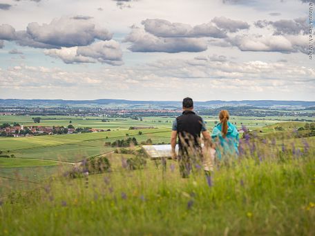 Die fünfte Etappe des Ries-Panoramaweges führt durch den Klostergarten mit Insektenhotel und Streuobstbäumen zum Klosterweiher, wo mehrere Biber ihr Revier haben. Über das Reimersbergle geht es zum