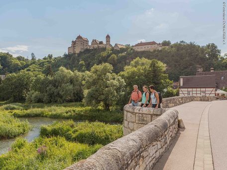 Vom Unteren Burgparkplatz führt der Weg auf idyllischen Wanderwegen hinab in die historische Altstadt zum Marktplatz mit historischem Brunnen. Auf einem Felsen über der Stadt thront hier majestätisch