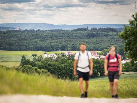 Die siebte Etappe des Ries-Panoramaweges führt an der Klostermauer entlang und in den Wald hinauf. Zwischendurch an einer landwirtschaftlich genutzten Lichtung mit Blick auf die Klosterkirche vorbei,