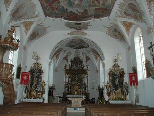 mehr dazuBedeutender ländlicher Barockbau, der, obwohl er tatsächlich relativ klein ist, doch sehr mächtig wirkt. Seitenaltäre (1731/32) und prächtige Kanzel (1736/37) von Johann Georg Bschorer.